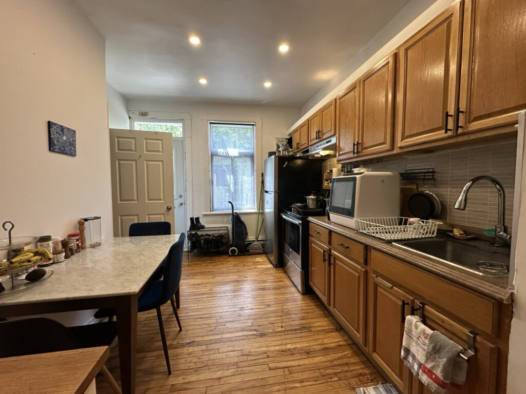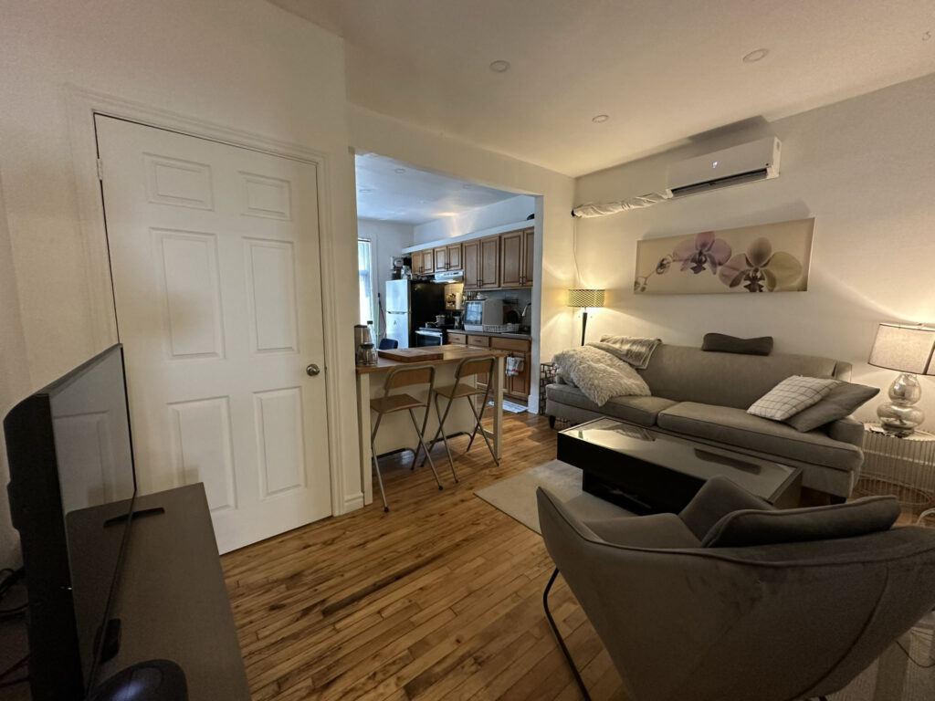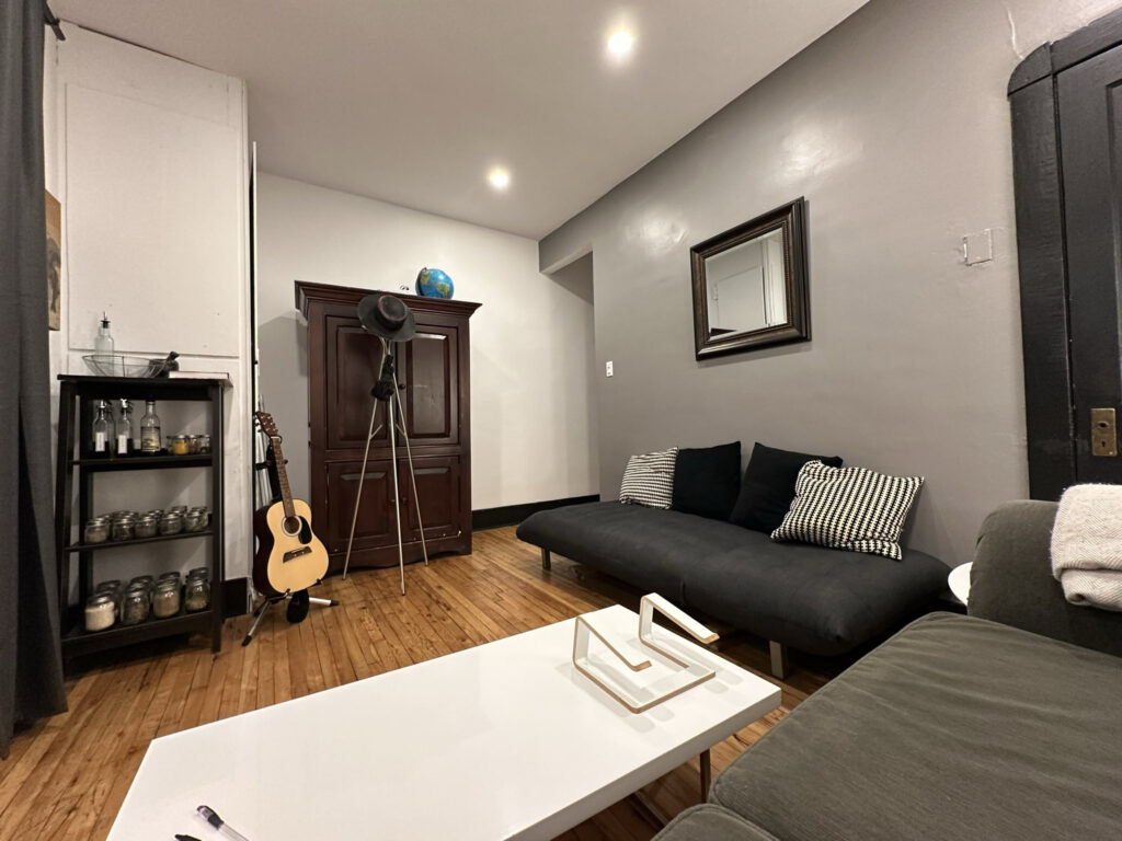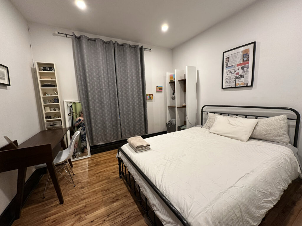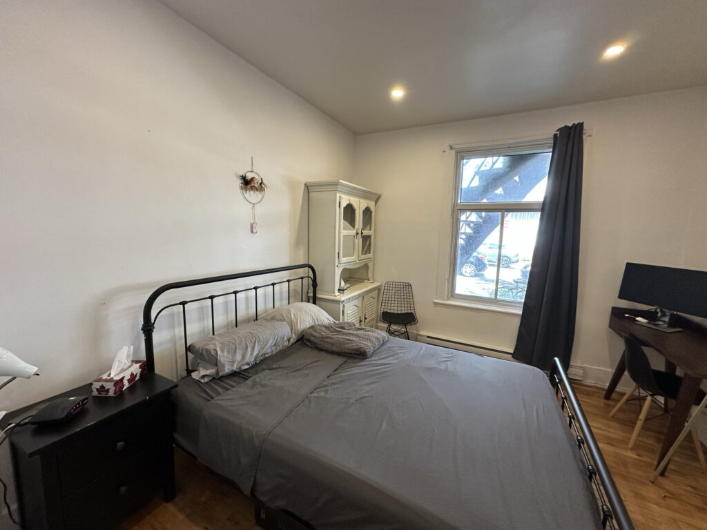 a private, light filled bedroom with a desk and chair. There is a shared living room, kitchen and bathroom with in suite washer and dryer and a bathtub. Ideal for an individual or couple traveling to Montreal and working primarily off site, who want a cozy, safe, budget-friendly shared place.