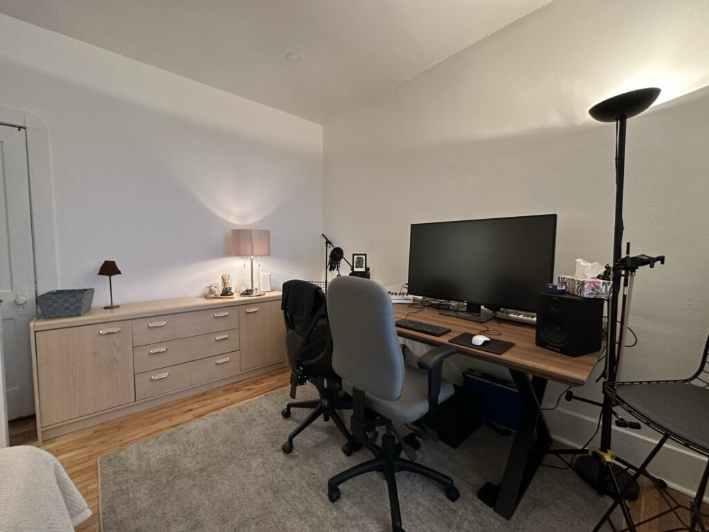 A quiet refuge, perfectly set up for remote work in comfort and style, with a large monitor and spacious desk. Ideal for an individual or couple traveling to Montreal and wanting their home to be tranquil and conducive to work.